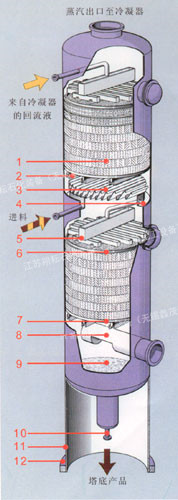 1、規(guī)整填料 2、支撐柵板 3、液體收集器 4、集液環(huán) 5、多級槽式液體分布器 6、填料壓圈 7、支撐柵板 8、蒸汽入口管 9、塔底 10、至再沸器循環(huán)管 11、裙座 12、底座環(huán) 此結構適合于直徑大于等于800mm的填料塔。 |